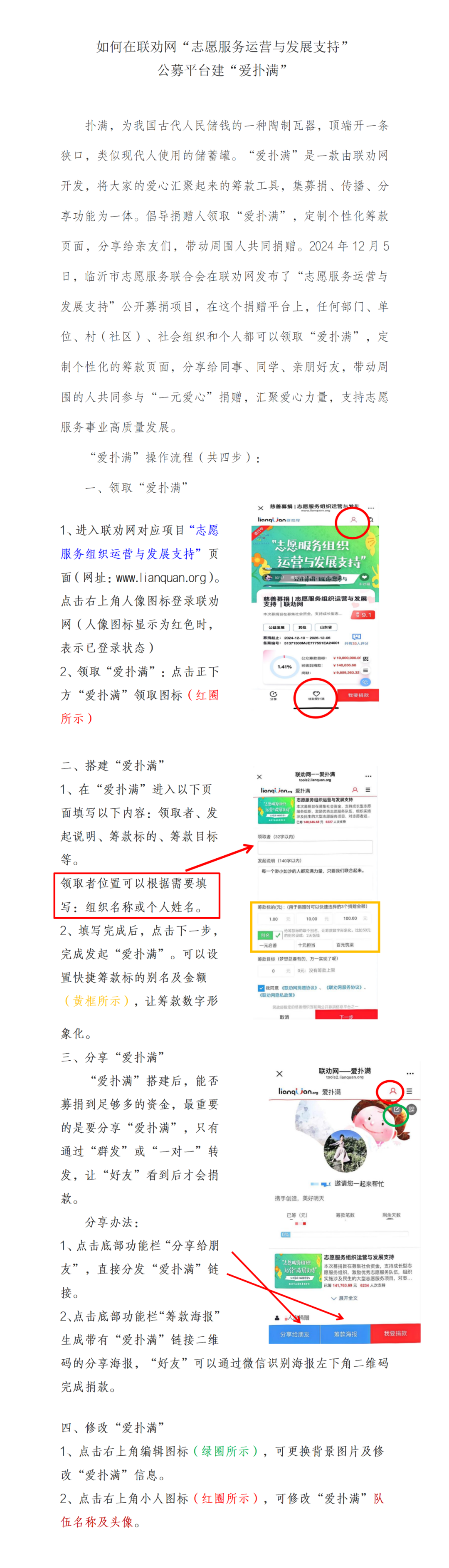 “爱扑满”是由联劝网精心开发的一款创新型筹款工具,它集募捐、传播、分享功能于一体,犹如一个汇聚爱心的“资金池”。在联劝网临沂市志愿服务联合会发布的“志愿服务组织运营与发展支持”公开募捐项目平台上,它为全市各类单位、组织及个人提供了汇聚爱心支持志愿服务活动开展的便捷途径。“爱扑满”的使用方法如下: