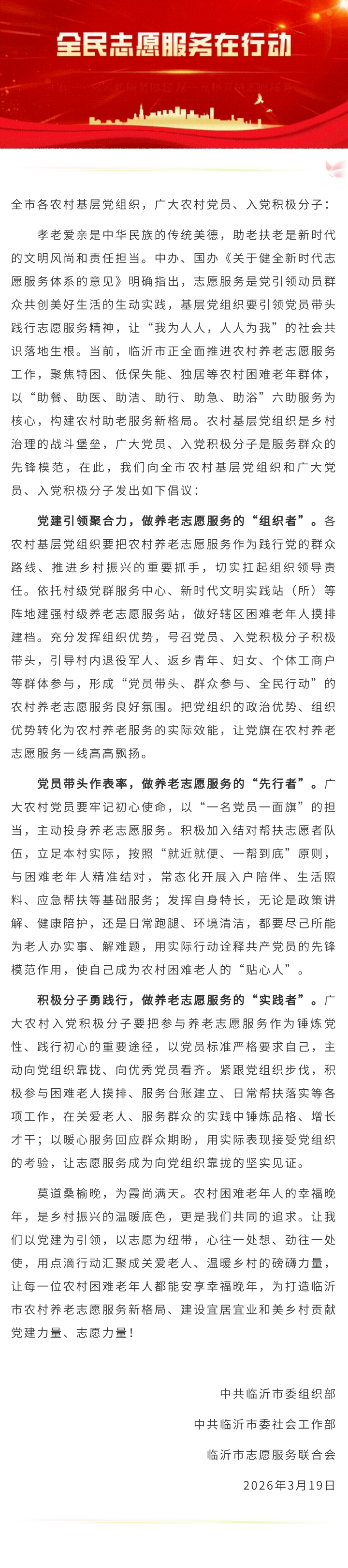 致全市农村基层党组织和广大党员、入党积极分子参与农村养老志愿服务的倡议书